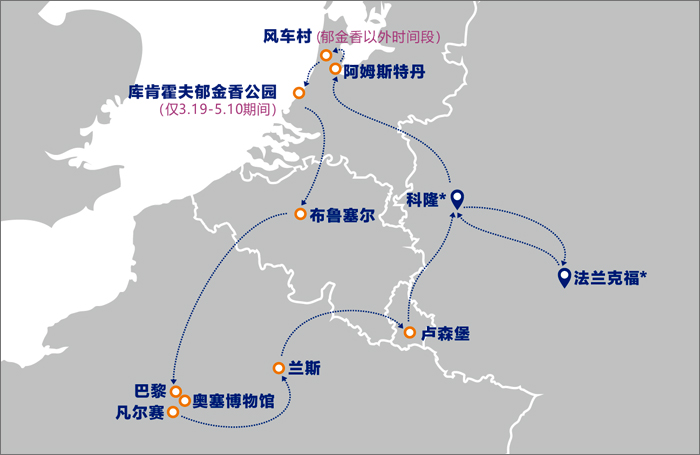 *法兰克福 - *科隆 - 阿姆斯特丹 - 布鲁塞尔 - 巴黎 - 兰斯 - 卢森堡 - 科隆*- 法兰克福*
