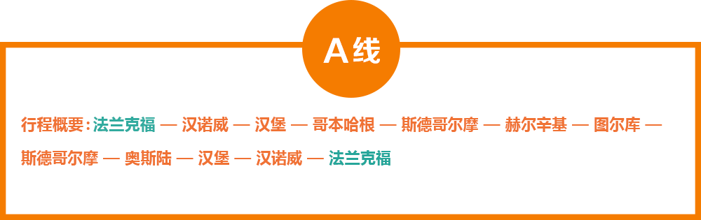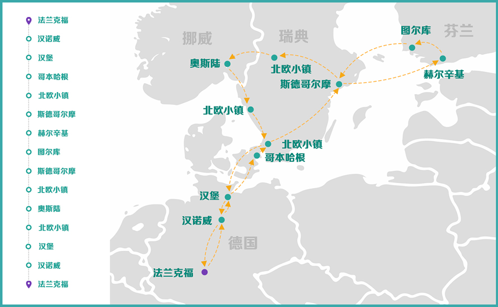 汉堡*–渡轮-哥本哈根–赫尔辛堡–斯德哥尔摩–维京邮轮(夜宿)- 图尔库 -赫尔辛基–维京邮轮(夜宿)-图尔库- 斯德哥尔摩- 北欧小镇- 奥斯陆- 北欧小镇- 哥本哈根- 渡轮-汉堡*