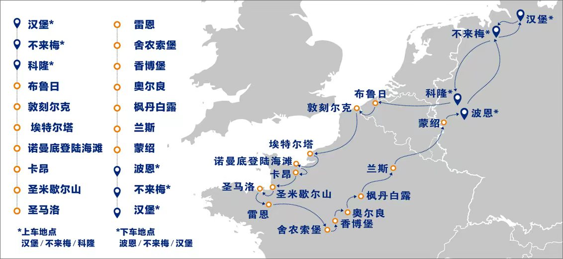 *汉堡- *不来梅- *科隆- 布鲁日- 敦刻尔克 - 埃特尔塔 - 诺曼底登陆海滩 - 卡昂 - 圣米歇尔山 - 圣马洛 - 雷恩- 舍农索堡 - 香博堡 - 奥尔良 - 枫丹白露 - 兰斯 - 蒙绍 -波恩*- 不来梅*-汉堡*