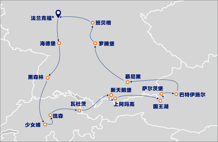 法兰克福*→ 海德堡→ 黑森林→ 因特拉肯→ 少女峰→ 琉森→ 富森→ 新天鹅堡→上阿玛高 → 国王湖→萨尔斯堡→ 巴特伊施尔→ 慕尼黑→ 罗腾堡→ 班贝格→法兰克福*