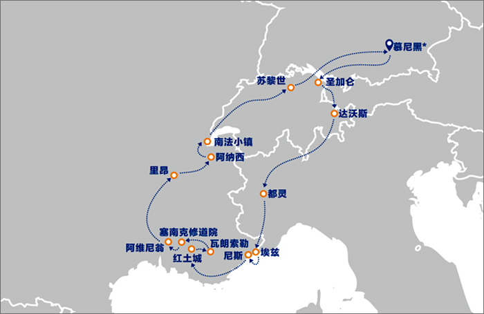 早餐后出发,继续普罗旺斯“闻香之旅”。首先前往普罗旺斯的红土城。红土城,作为颜色原料赭石的采掘场,从罗马时代就很有名了,在红土城唾手可得的红黄土经过加工后可以成为饱和度极高的颜料。梵高和高更都特别偏爱这个地区出产的颜料,这也是梵高作品里颜色浓烈的原因之一,喜爱绘画的游客一定不要错过红土城小店里这令人向往的天然颜料。瓦伦索勒,是薰衣草种植最密集的地区,在每年的薰衣草花季,眼见所及全部都是紫色的薰衣草田,绵延无际宛如置身于天堂的梦幻感动,连空气中都弥漫着薰衣草与泥土的芬芳,只有在这里才可以看到真正大片的薰衣草,属于普罗旺斯的紫色梦幻之地。如果幸运,还有机会看到薰衣草和向日葵交相辉映的盛况。随后前往著名的“塞南克修道院”,这里的熏衣草花田和山谷景观被称为“全法国最美丽山谷”,成为无数著名的影视剧中的著名浪漫场景。