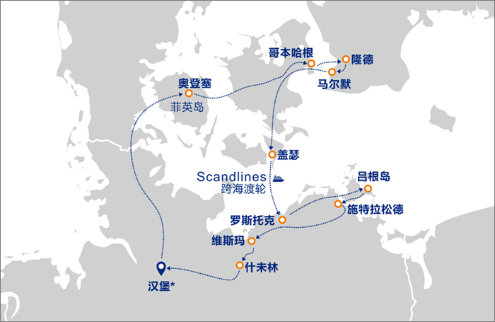 *汉堡- 菲英岛- 奥登塞- 哥本哈根- 隆德- 马尔默- 盖瑟- 跨海渡轮- 罗斯托克- 吕根岛- 施特拉松德- 维斯玛- 什未林- 汉堡*