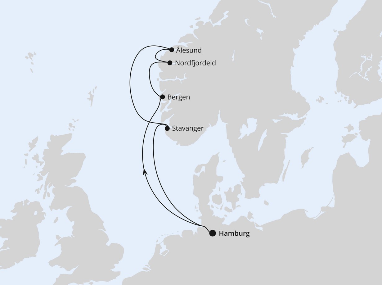 汉堡(德国)一卑尔根(挪威)一 北峡湾(挪威)一奥勒松(挪威)一斯坦万格/吕瑟峡湾(挪威)一汉堡(德国)