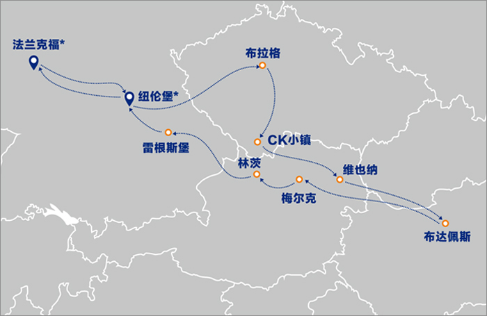 法兰克福*- 纽伦堡*- 布拉格- CK小镇- 维也纳- 布达佩斯- 梅尔克- 林茨- 雷根斯堡- 纽伦堡*- 法兰克福*
