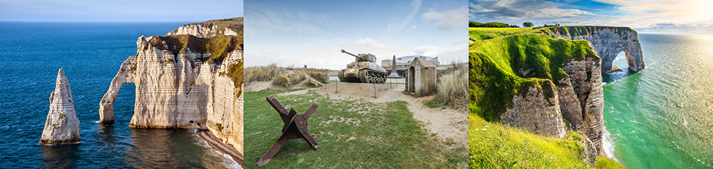 “法国第一海岸”埃特尔塔,绵延数公里 ──它壮丽而深远,像是一堵屹立在波澜壮阔的大海边缘的巍峨屏障;峭壁神工鬼斧, 自然地开凿出三个大“拱门”, 顶天立海,气势浩瀚。